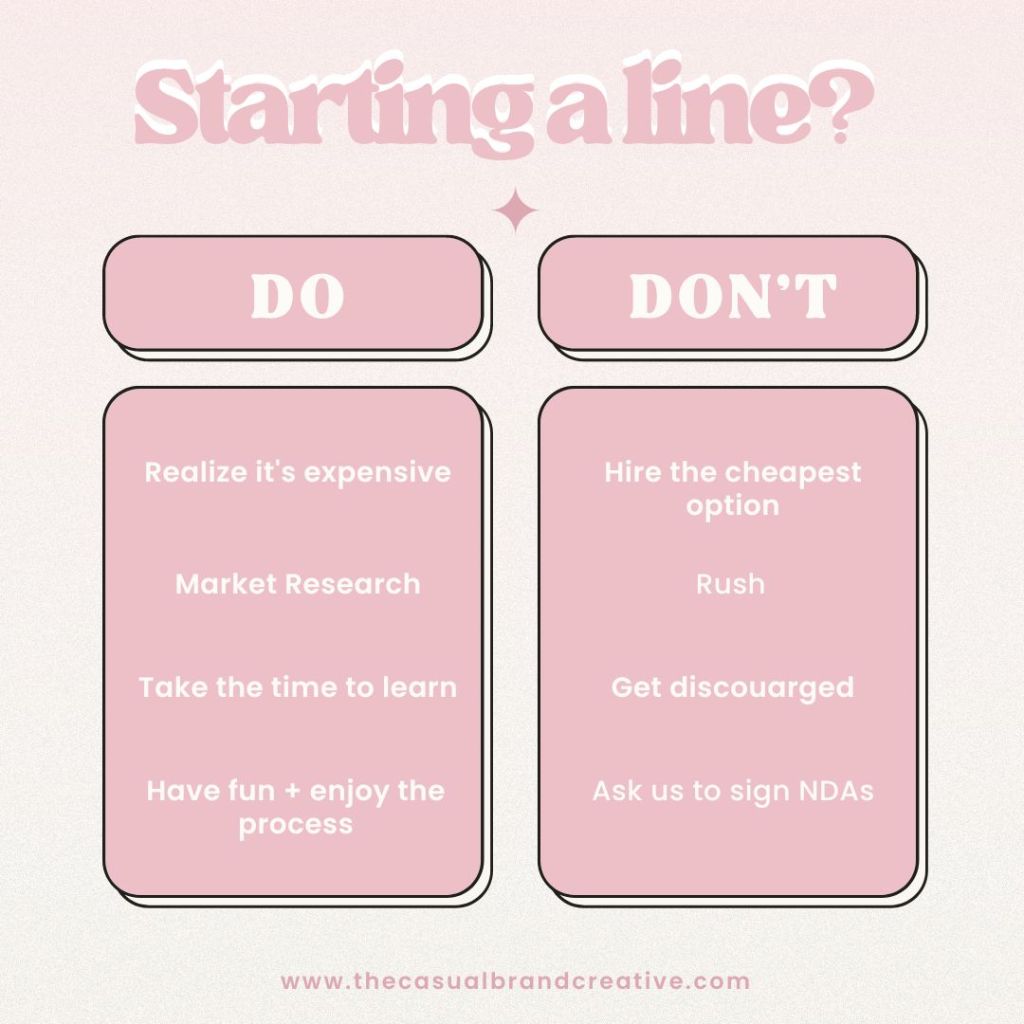 - Rush. I know you’ve spent x amount of months trying to nail down that perfect fabric. Don’t settle for the one you think is a little bit too scratchy just because you want to get to the finish line. If you don’t absolutely love what you’re creating, don’t expect someone else to (and pay money for it).